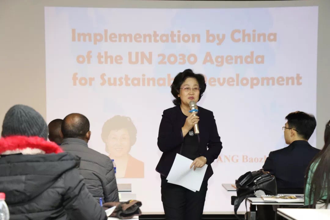 On the morning of the 18th, Ms. Yang Baozhen, former consul in France and former senior project officer of the Canadian International Development Agency, gave a lecture on “Implementation by China of the UN 2030 Agenda for Sustainable Development”, which introduced China's major achievements in poverty alleviation, education, health, women's status, environmental protection, peace and justice, and international cooperation in recent years. Ms. Yang Baozhen pointed out that China is willing to share experience with developing countries and contribute to the early realization of the United Nations Sustainable Development Goals. In the course of lecture, Ms. Yang cited a large number of vivid practical cases based on her own experience. After class, the students asked questions and had in-depth exchanges with Ms. Yang.