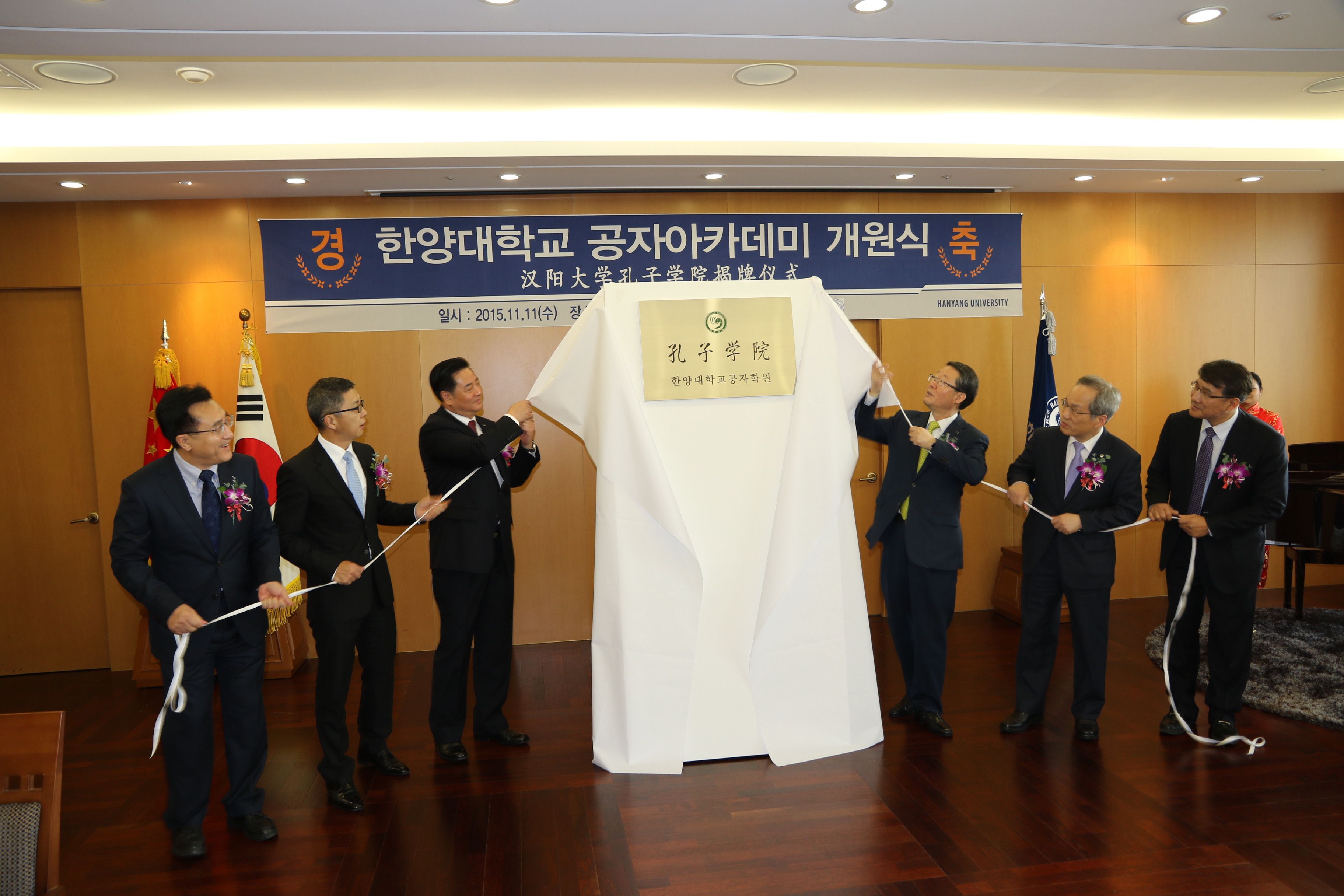 揭牌仪式。汉阳大学常务副校长金会律、副校长李承哲、国际交流处处长李基晶、国际语博彩App
