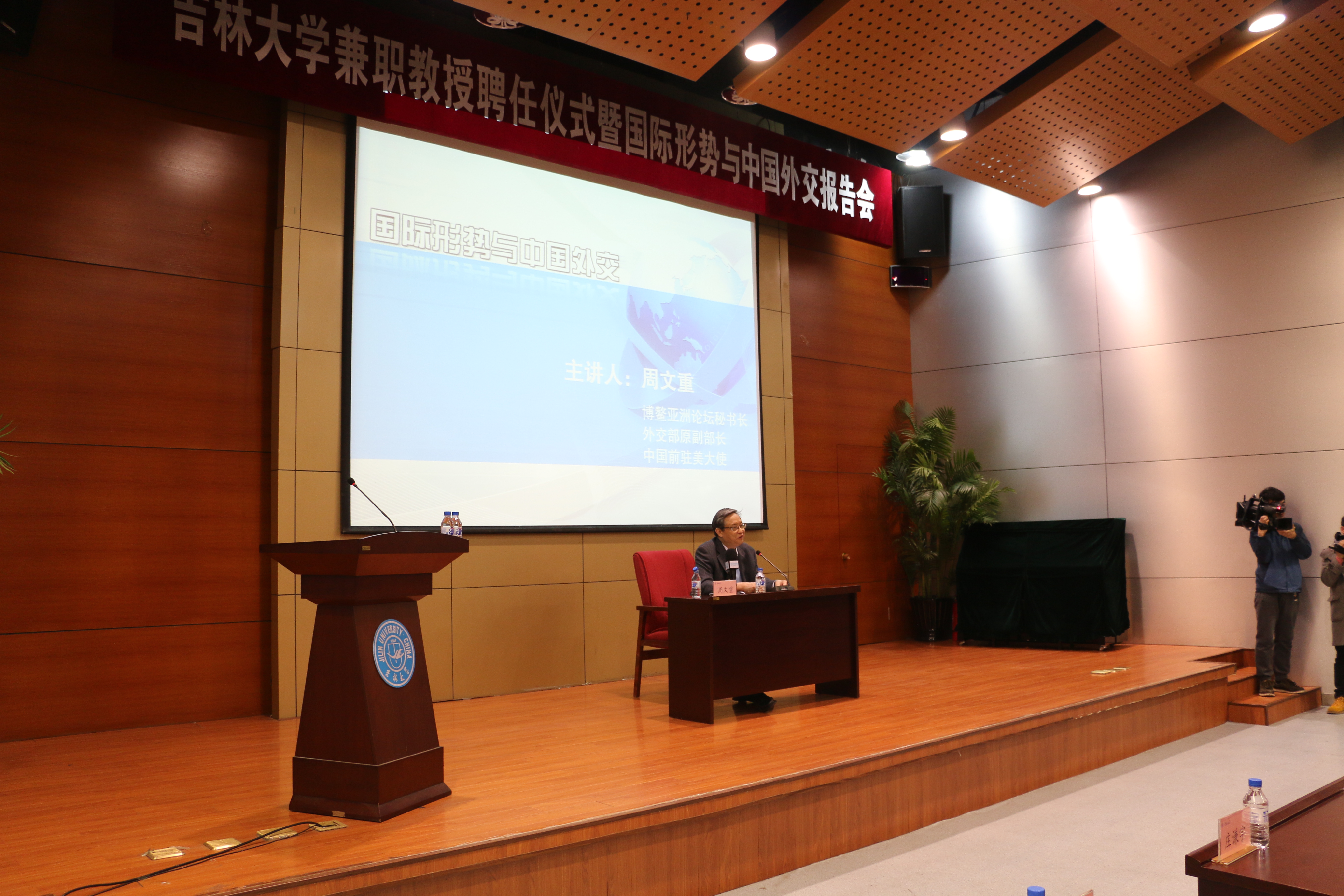 兼职教授聘任仪式暨国际形势与中国外交报告会在中心校区国际学术讲堂举行。外交部原副部长、博鳌亚洲论坛秘书长周文重受聘吉大博彩App