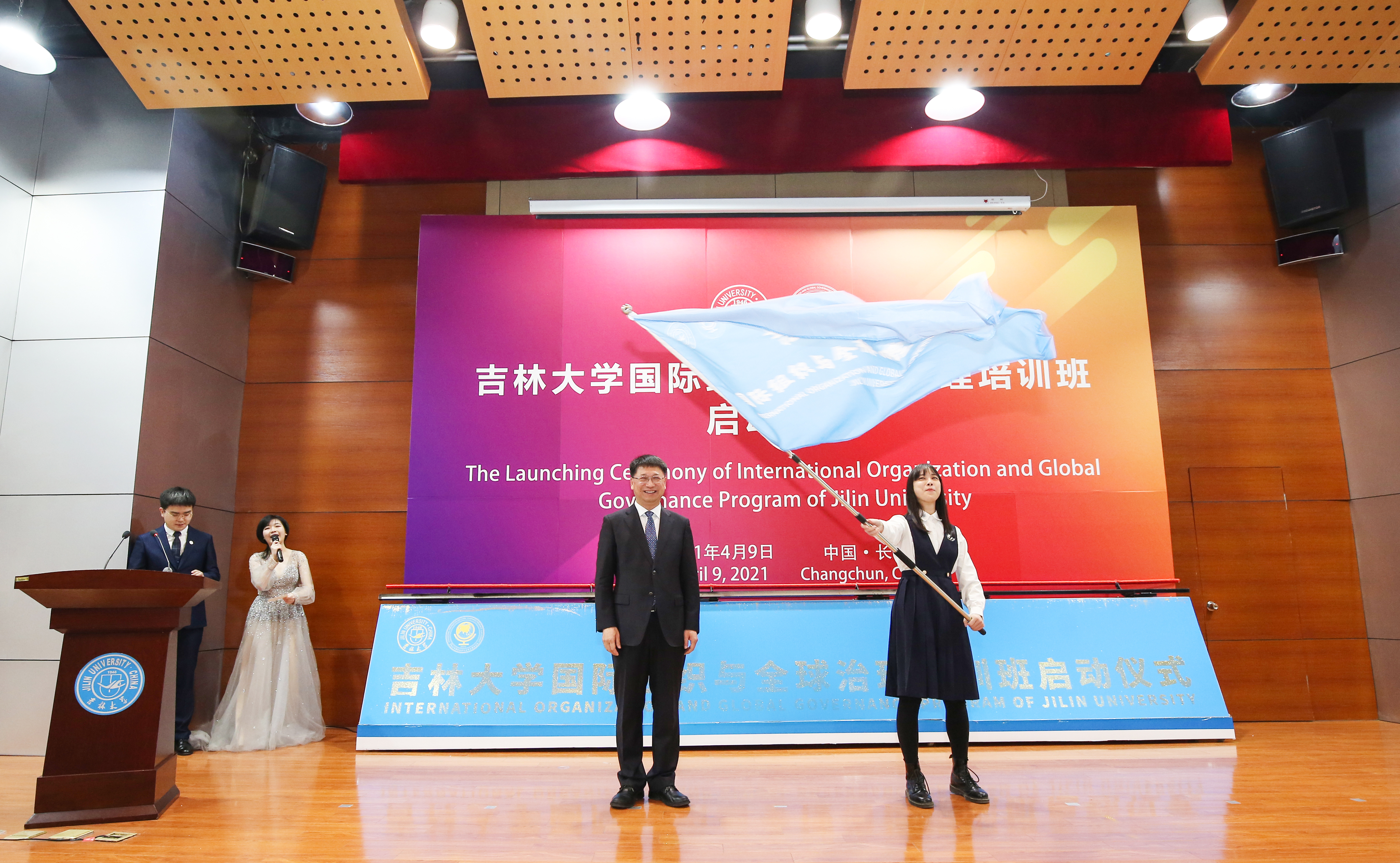仪式上,张希校长和其他与会嘉宾一道为首期国际组织与全球治理培训班推动了启动杆,并为学员代表授旗。学生怀着激动的心情从校长手中接过班旗,飘舞的旗帜伴随着现场热烈的掌声,见证了培训班的正式启动。