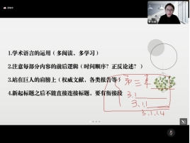 陈曦对论文写作中的常见误区进行了细致阐述,分别从文章框架问题、具体写作问题、学术规范问题、其他注意事项四个方面进行了介绍。她强调,论文在结构上应当进行反复推敲,应该尽量保持各章节主题、子标题数量和内容字数的平衡。其次,要注重衔接段的运用,用符合学术规范的方式引用定义、图表与数据。此外,陈曦还在学术语言的运用、每部分内容的前后逻辑衔接、写作具体节奏安排等方面给出了建议。这些分享都是基于以往在论文指导过程中出现的常见误区,这些误区的规避能够对于写作一篇高质量论文大有助益。