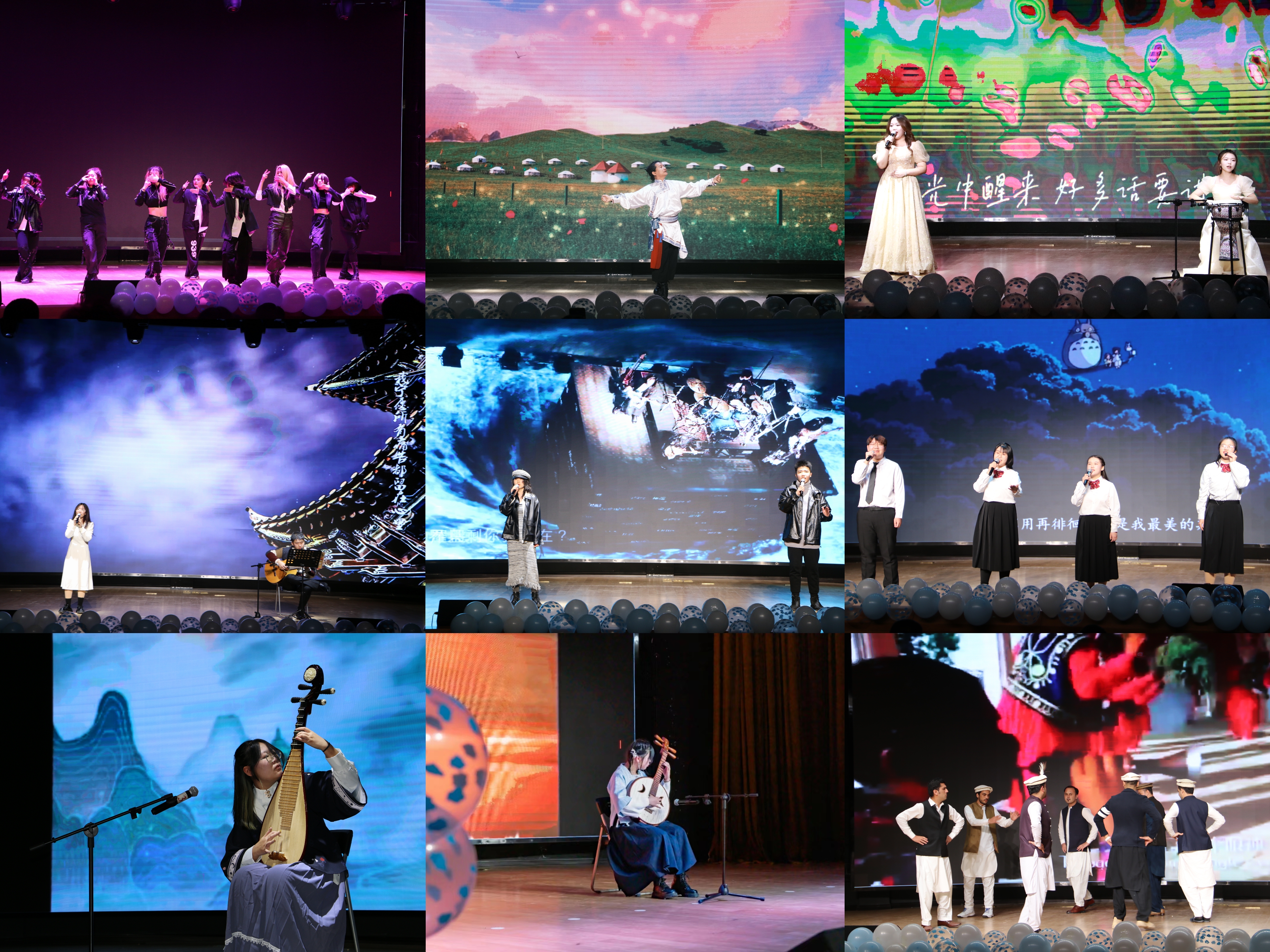 舞台灯光聚集,Crush舞团的开场舞《MANIAC》闪亮登场。节奏强烈的音乐,动感张扬的舞姿,点燃全场。郑翀演唱的《富士山下》以及团学主席团和部长们带来的《稻香》动人心弦,他们用温暖的歌声再现刻在唱片里的时代记忆。天苍苍,野茫茫,孟翔冲老师用矫健的舞姿讲述来自蒙古草原《天边》的故事。舞蹈《Dancing with a stranger》、《Ilusion & Perfect Night》以及《舞动快乐青春》律动青春节奏,舞出闪耀光芒。宋奇翰打着快板《说点儿》,希望大家“幸福靠近点儿,烦恼走开点儿”。小品《谁杀死了周日》将时间拟人化,用幽默风趣的方式启示大家珍惜时间、拒绝拖延,收获了观众们的阵阵欢笑。乐器演奏与独唱《这世界那么多人》旋律动听,一句“多幸运,我有个我们”启迪我们“遇见即是幸运”。扫动琴弦,吉他弹唱《星瓷》温情舒缓,展现音乐温婉的美。合唱《少年他的奇幻漂流》与《最美的期待》借歌声传达少年期冀美好未来,终载星河航向未来。诗朗诵与独唱《少年中国说》诠释着中华民族自强不息的精神品格,彰显了身为新时代青年所担负的使命与担当。中阮演奏《丝路驼铃》呈现出的浓郁民族风情,使现场观众置身于千年前的丝路旅途之中;琵琶声清亮悠扬,一首《彝族舞曲》如同大地的鼓动,唤起了万物的欢欣。《路过人间》《肖邦A小调四舞曲》《凌美地》三首歌曲的串烧,将人声与琴声完美融合,把现场的艺术氛围与情感共鸣提高到一个新的境界。伴随全场热烈的掌声,晚会在留学生的民族舞蹈《Pushdo Attan》中接近尾声。