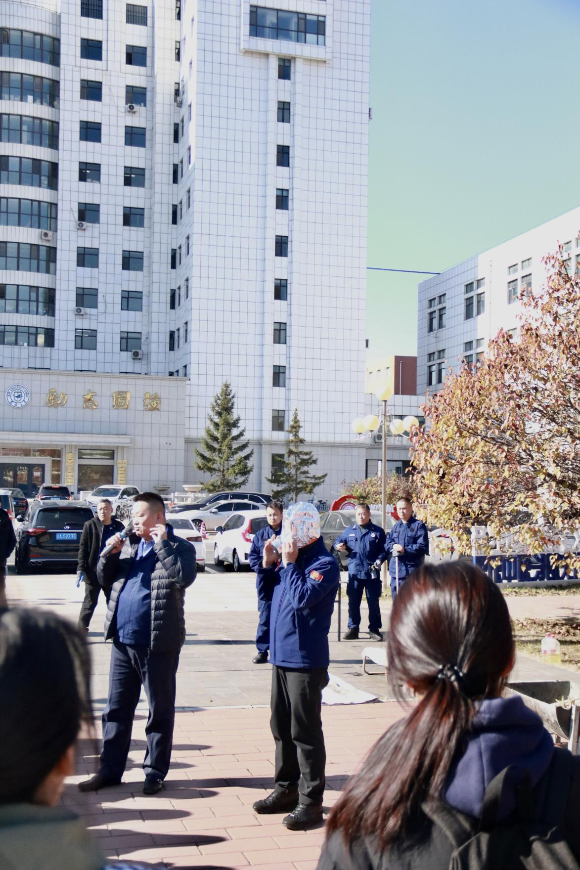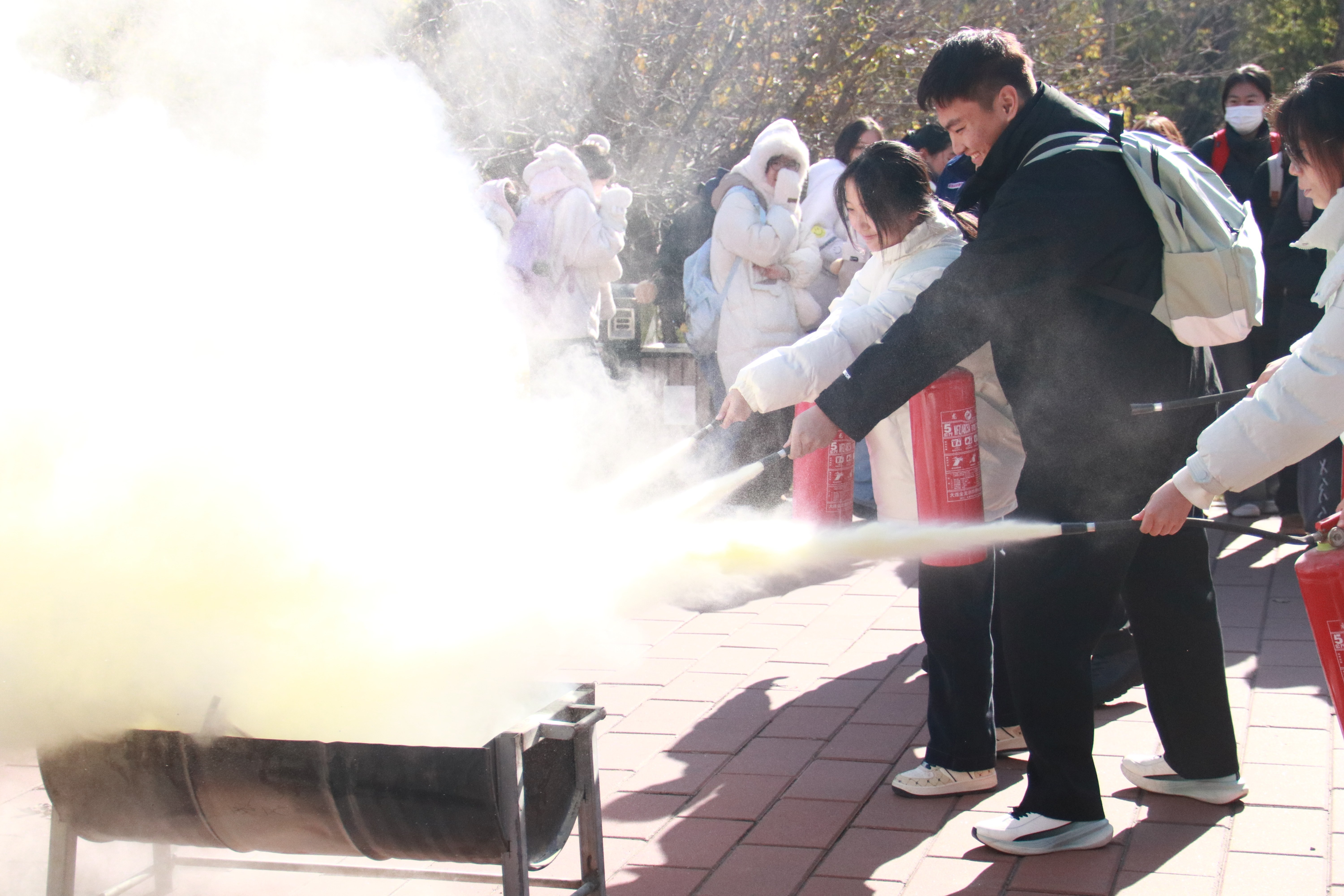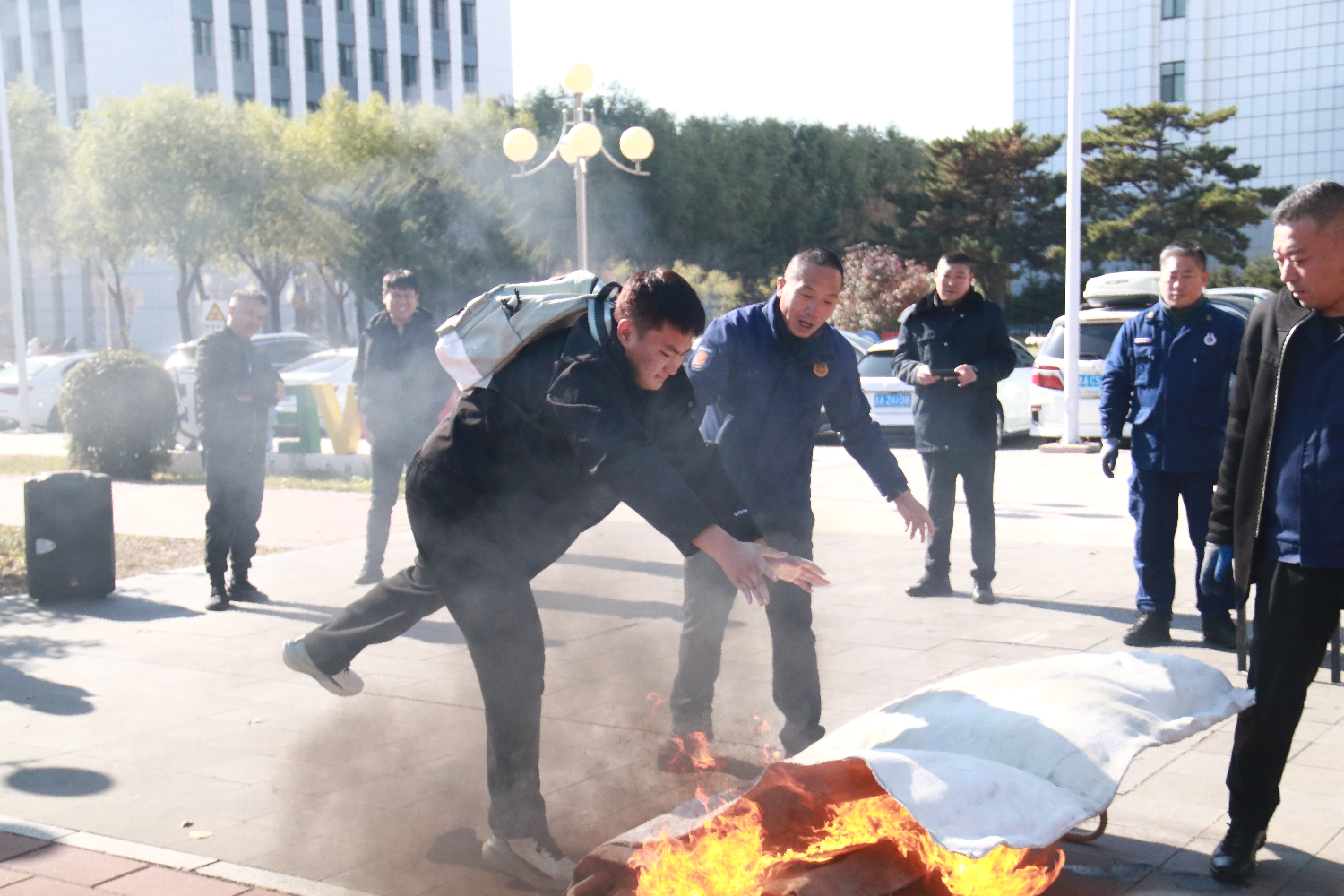 讲座结束后,全体参训师生移步至吕振羽楼前空地参加消防演练。保卫处消防科工作人员现场演示了消防面具、防火毯及灭火器的正确使用方法,并组织师生进行实际操作和灭火演练。大家踊跃参与,积极动手,在实操中巩固所学知识、掌握自救技能。整场演练过程组织有序、配合密切,师生反响热烈,普遍认为此次培训内容实用、形式生动,受益匪浅。