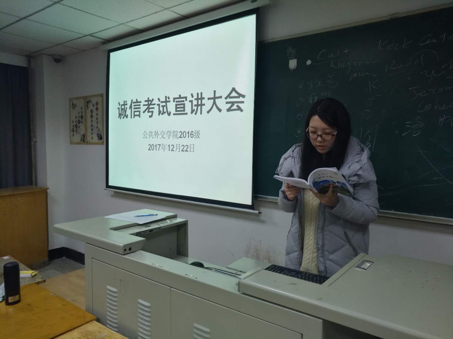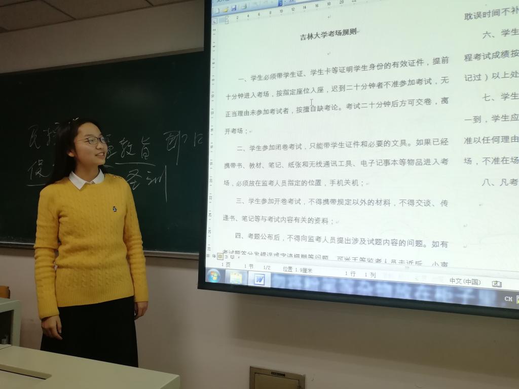 辅导员老师参加大一新生班级诚信考试教育年级会,强调考场纪律和考试要求,希望同学们在大学第一个期末考试里,能够全心投入,认真备考,劳逸结合,取得良好成绩。