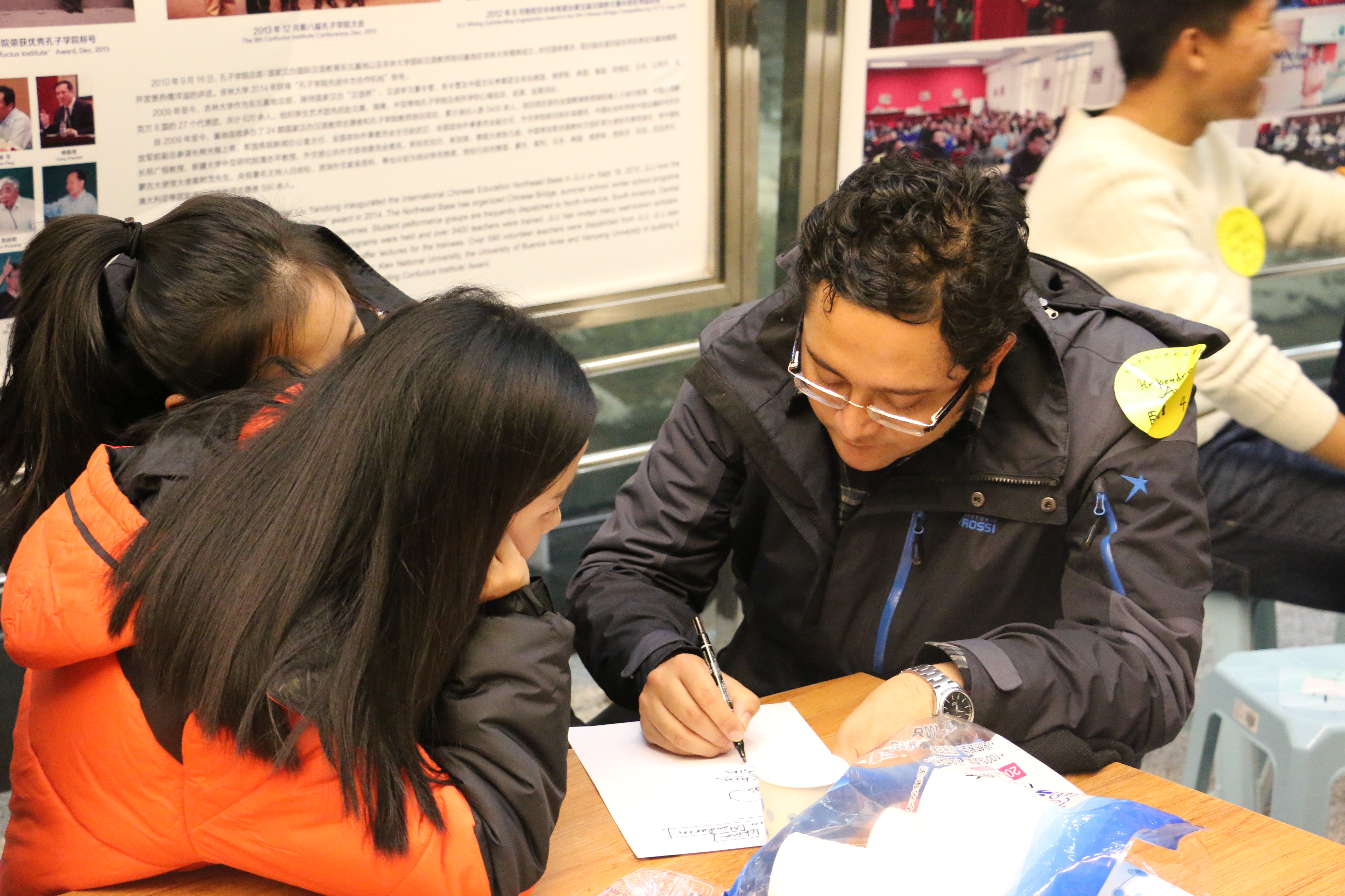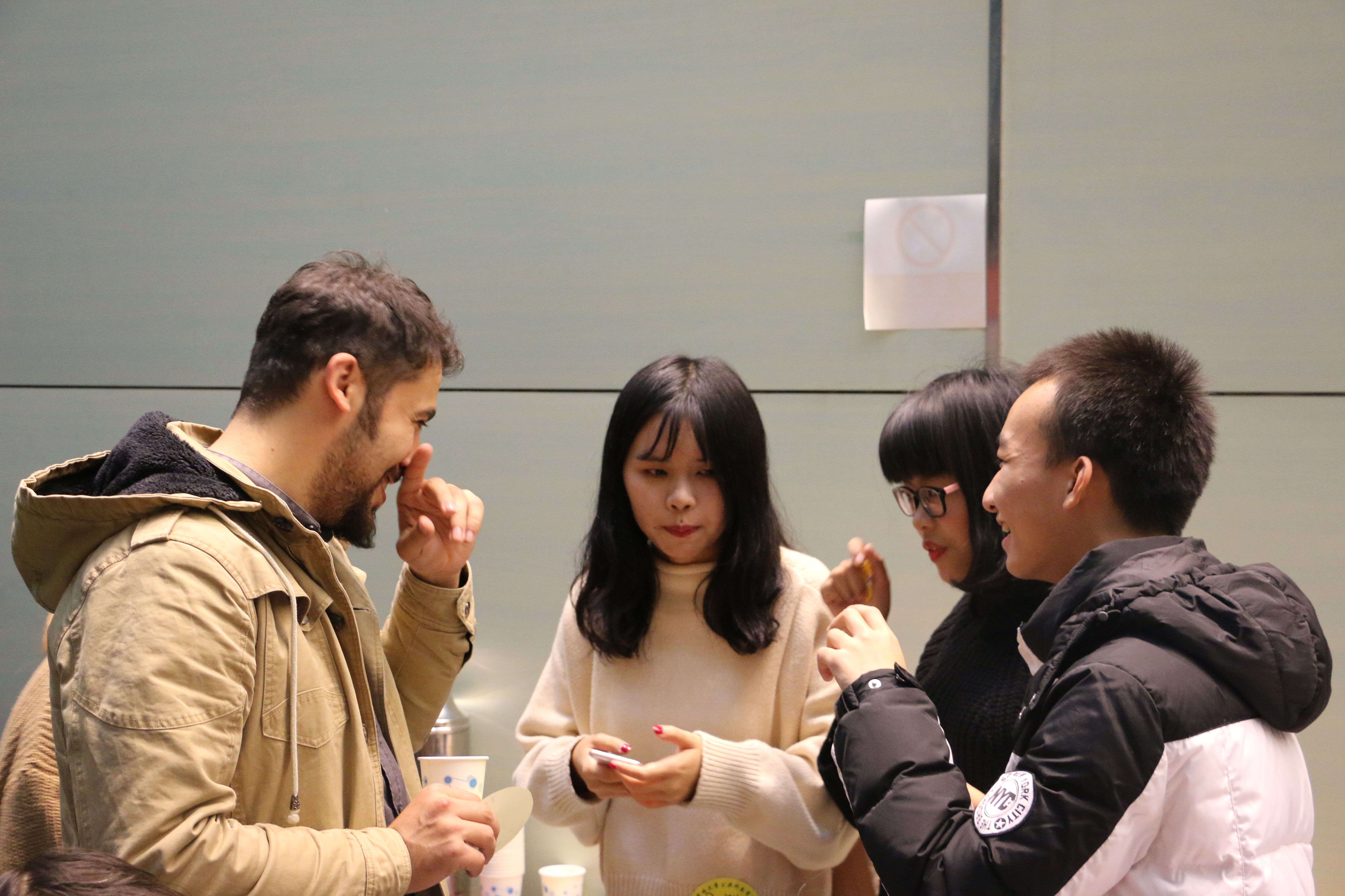 简短的游戏结束之后,活动进入茶话会阶段,同学们在冷餐区享用小食,用中英文聊天。会场气氛轻松和谐,中国学生教留学生如何写中文名并且纠正其中文发音,留学生们向中国学生介绍各国人文风情,会场内中文英文交叉,不同语言和文化碰撞出灿烂火花。