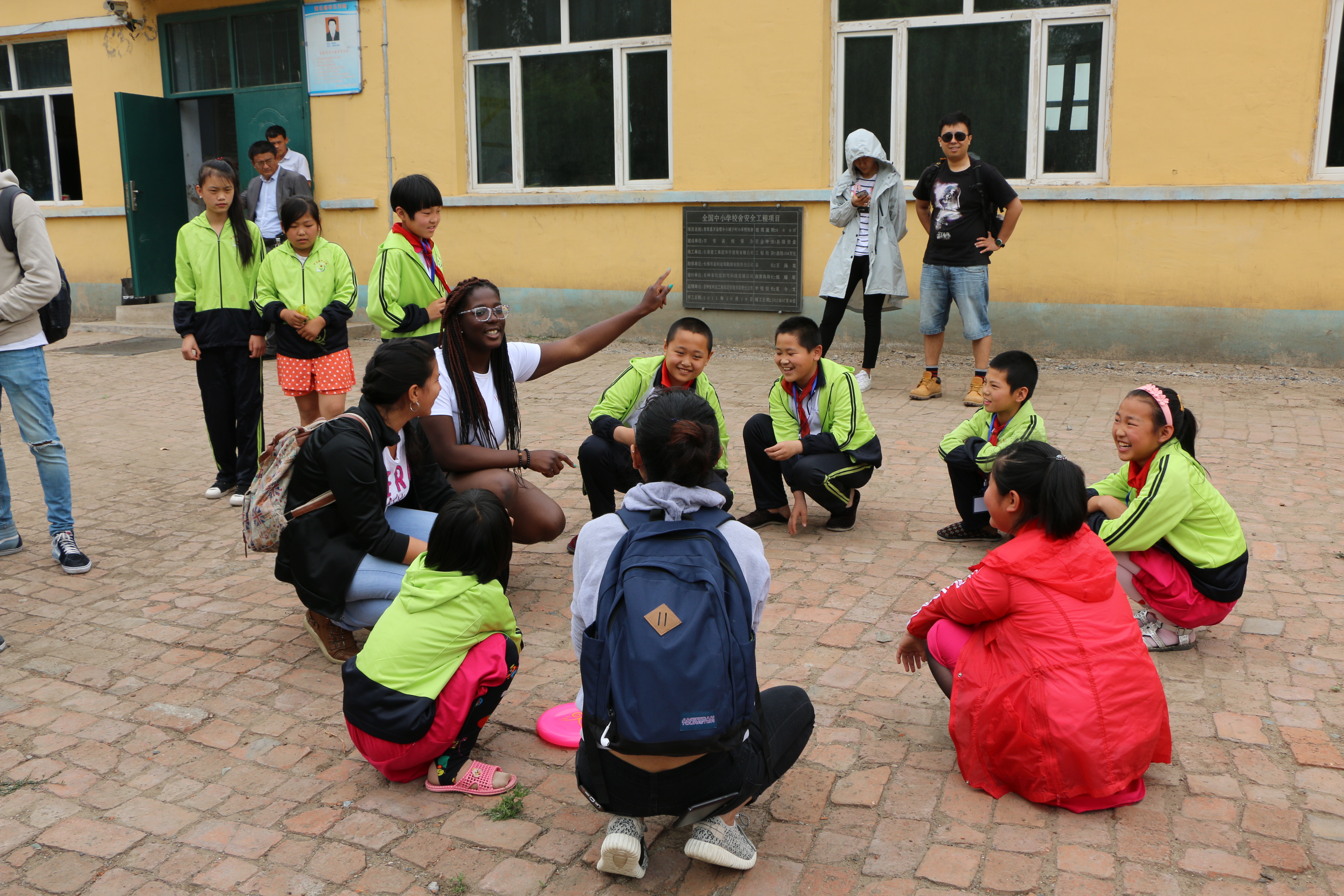 的留学生同学带小朋友们唱英文歌,小朋友们开心地融入到活动中。小朋友们也为远道而来的客人们表演了《让我们荡起双桨》等经典儿歌。节目过后,我们的留学生向小朋友们赠送了零食,文具和体育用品。我们的加拿大朋友们还绕有兴致地与小朋友们在操场上玩起了飞盘,做起了游戏。晌午将至,留学生和小朋友们依依不舍地道了别。