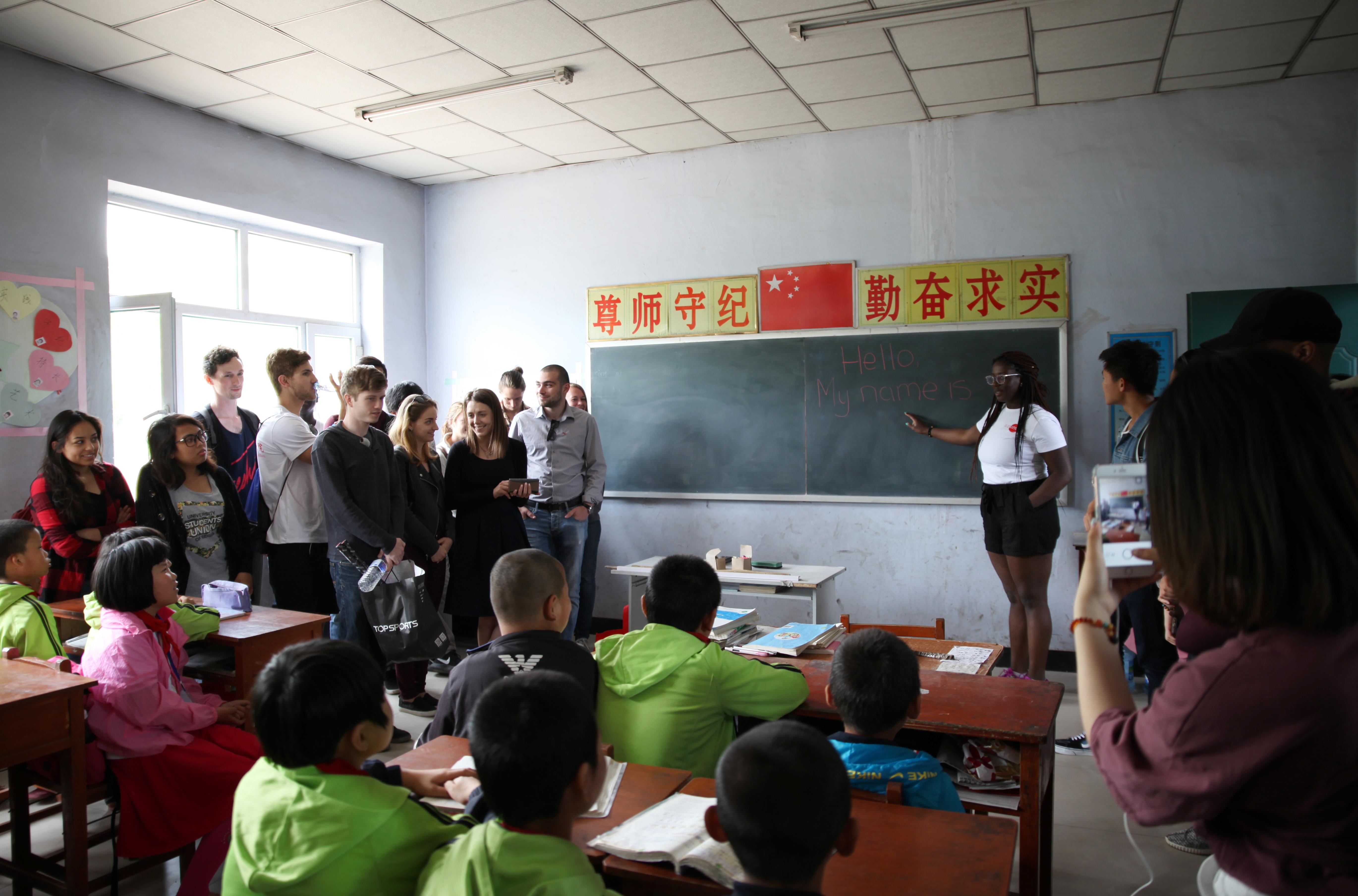 参加暑期班的里贾纳大学的留学生一同来到了农安县万金塔乡小城子村小学。当大家一走进五年级一班的教室,就立即被孩子们热烈的欢迎声所感染了。一张张稚气未脱的脸庞上洋溢着最纯真的微笑。微笑是没有国界的,这些来自异国的大哥哥大姐姐们被这些纯真的笑脸瞬间感动了。