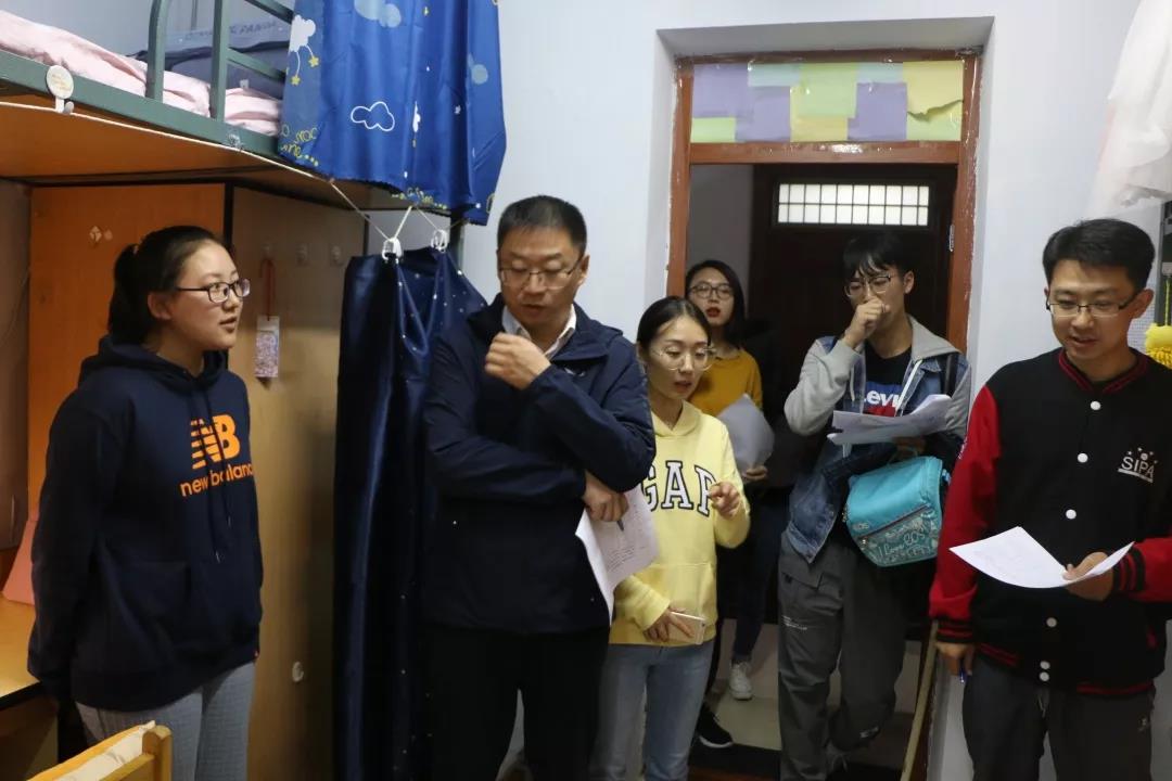 党总支书记杨民、2019级新生辅导员王力老师等人携团委学生会部分成员组成评委团,前往南苑九公寓、文苑一公寓对学生内务整理情况、寝室整洁情况、门窗卫生情况等一一进行了检查与评分。
