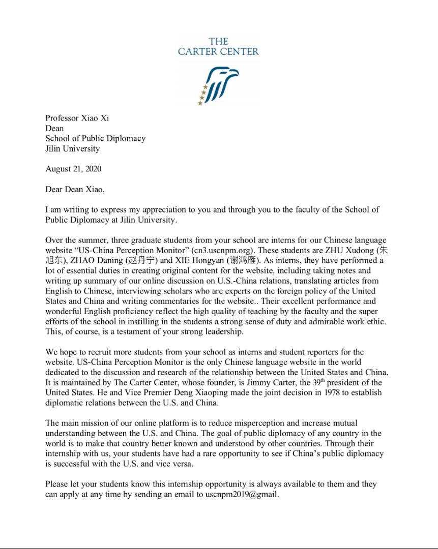四名学生在卡特中心中国项目部主办的中美印象网站实习期间的优异表现表示高度的赞扬和感谢。