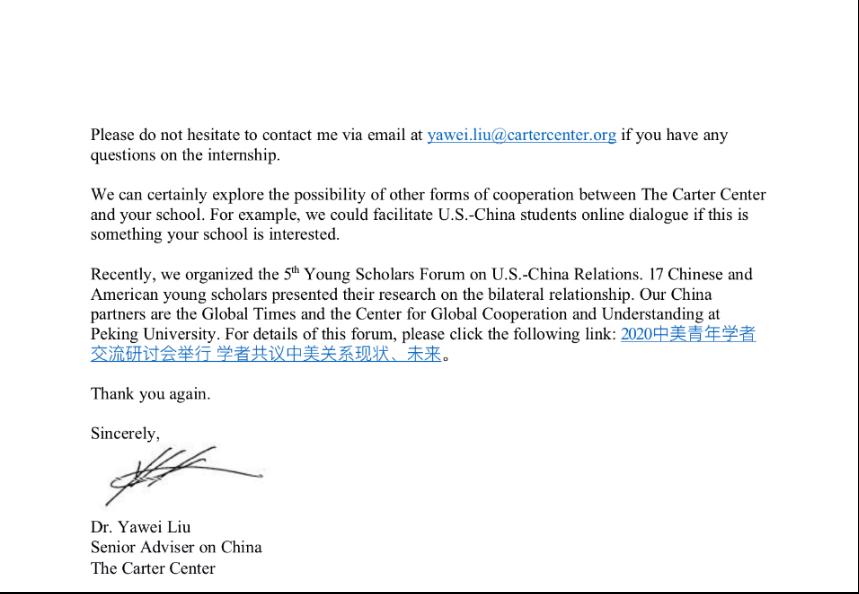 实习期间,四位同学主要负责美方新闻媒体与学者关于中美关系的文章编译工作;协助2020年第五届中美青年学者论坛、中美合作管控清单云上讨论会,“中美关系何去何从”民间外交论坛等国际会议的组织工作,记录和撰写会议摘要;中美印象网站的今日头条官方账号日常运营维护工作。此次宝贵的实习机会为同学们更全面地了解中美关系的发展与中美公共外交的实际成效提供了一个窗口,同学们纷纷表示受益匪浅,收获良多。同时,他们认真负责的工作态度和严谨踏实的工作作风也得到了卡特中心员工们的一致认可。