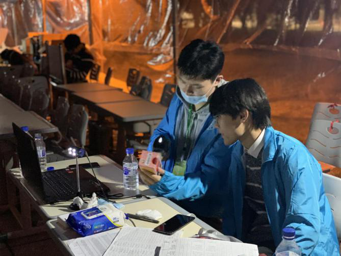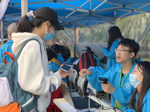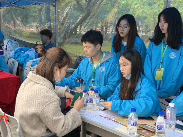 迎来了第一位2020级本科新生,在迎新工作人员的引导下,报到的同学顺利进行了身份审核、资料交接、校园卡和银行卡领取以及核对签字。疫情期间,报到工作更须谨慎对待,所有在岗志愿者们都认真细致地对待各项工作,尽力做到不遗漏任何细节。