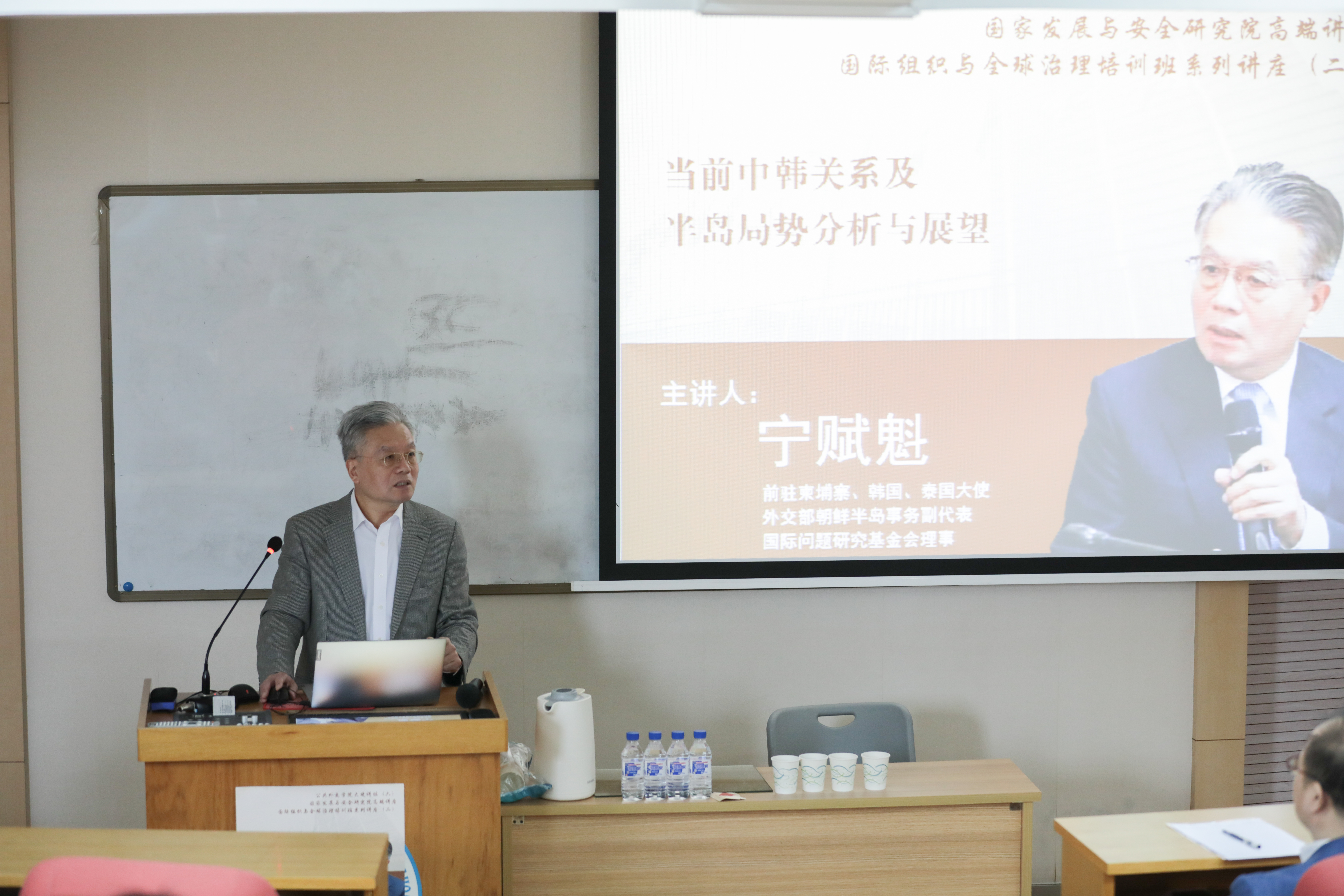 4月25日上午,前驻柬埔寨、韩国、泰国大使,外交部朝鲜半岛事务副代表,国际问题研究基金会理事宁赋魁大使作题为《当前中韩关系及半岛局势分析与展望》专题讲座。讲座由国家发展与安全研究院副院长郭锐教授主持,博彩App