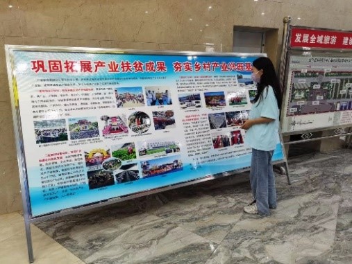在闽宁镇原隆村,刘纯乐、王玉蓉和张雯同学通过村内的宣传展板了解到,当地的特色农业主要以葡萄、枸杞和养殖业为主。当地村干部介绍道:“闽宁镇的乡村振兴模式聚焦酿酒葡萄种植、肉牛养殖、文化旅游等特色产业,形成了政府引导、企业带动、群众参与的产业扶贫格局,探索出了“支部+农户+企业”的产业扶贫模式,最终形成了独具特色的闽宁模式,这将成为闽宁地区区域发展合作的新标杆。”