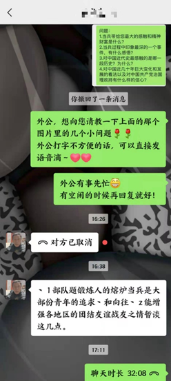 最后,团队成员对身边的退役军人和优秀共产党员代表进行了访谈,通过线上的亲切交流,队员们重温了他们精彩的军旅生涯,感受到了他们对当前宣扬红色革命文化、传承红色革命精神的支持,同时针对当前红色教育现状,他们结合自身经历提出了一些宝贵建议。(注:由于疫情防控原因,访谈通过线上进行。)
