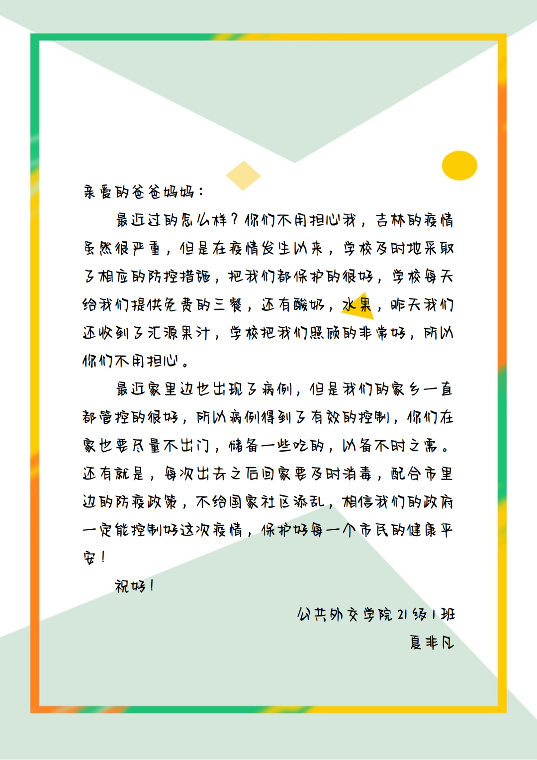 举办了一封“家书”征集活动,鼓励外交学子们给家人写一封家书,介绍封校期间的学习生活情况,传达自己的封寝感受,分享自己的抗疫志愿活动经历。
