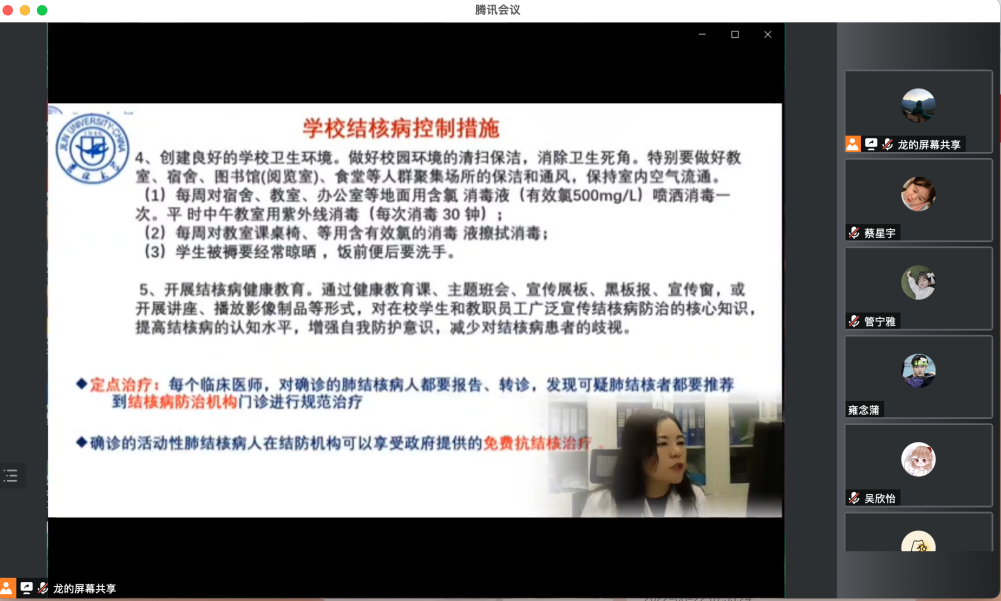 阚老师向同学们介绍并讲解了校医院的基本概况以及医疗证、医保卡使用的相关知识和医院转诊报销制度,告诉大家“加大高校健康教育”的重要性。同时,阚老师还针对常见的五大传染病——新冠肺炎,艾滋病,结核病,水痘,乙类病毒性肝炎对广大新生进行细致入微地讲解。阚老师告诉同学们在校期间应做好个人防护,并强调要提高健康安全意识。