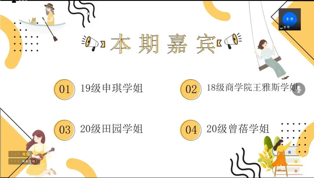 团委学生会学习发展部筹办了本学期第二期线上“青春分享课堂”活动。本次活动由21级本科生曾静主持,邀请到了19级本科生申琪、20级本科生曾蓓、田园和商博彩App