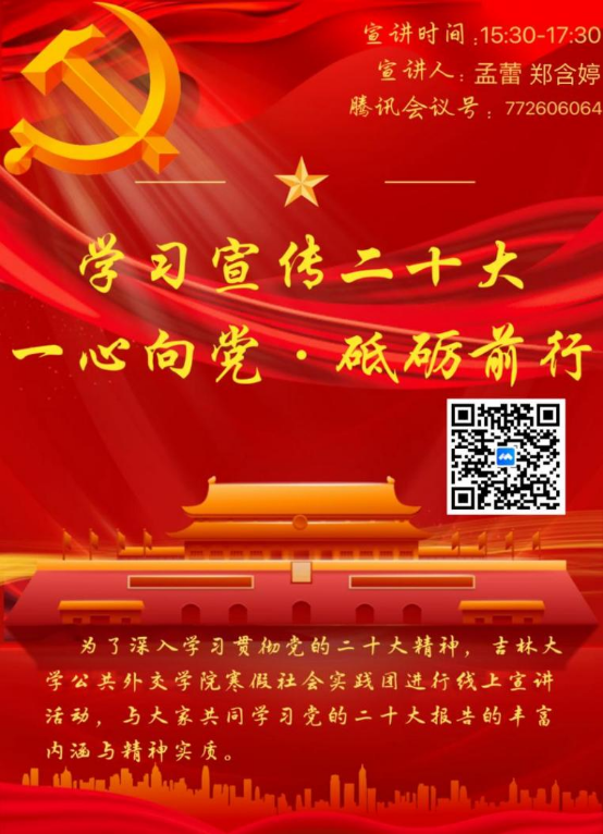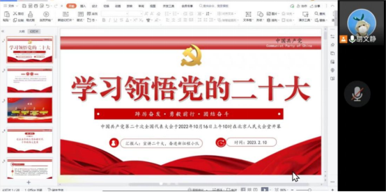 在宣讲活动开始之前,小队自主设计了相关海报,并进行了广泛宣传。2023年2月10日晚八点由胡文静、李佳慧、李宝彤、张旭晖四人分工协作正式开展了线上宣讲,共有近四十人参与了本次会议。主讲人结合有关视频生动形象地分析和讲解了有关二十大的部分内容,宣讲效果良好。