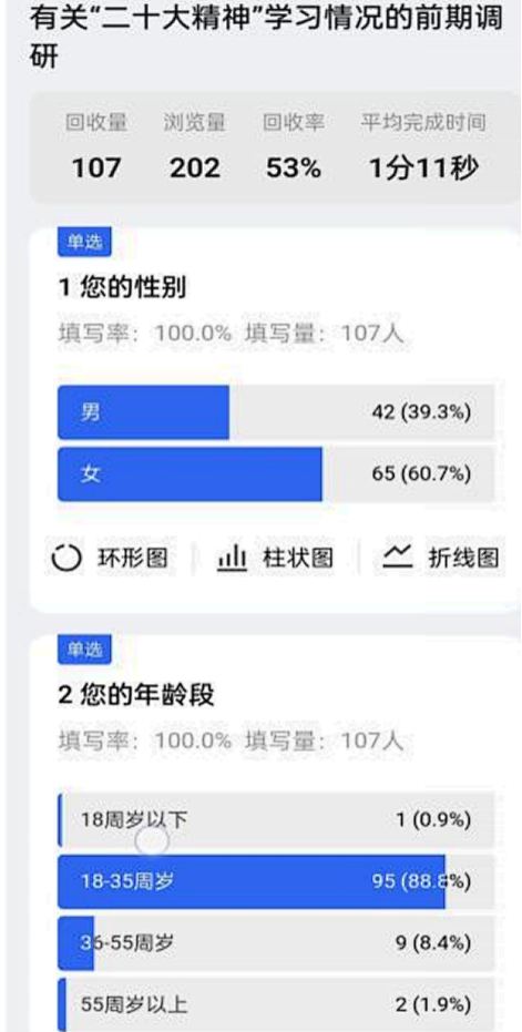 在活动前期,小队展开了全面细致的调研分析,面向全国各地,核心关注大学生群体,以问卷调查和焦点访谈为主要方式。《有关“二十大精神”学习情况的前期调研》和《有关“二十大精神”宣讲和访谈情况的反馈调研》两次问卷数据收集为实践团队后期宣讲做了充分的准备。