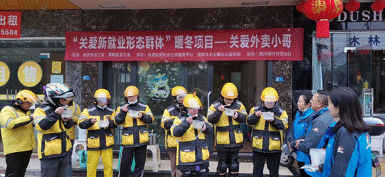 “春风送暖入蜀冬”小队,协助自贡市总工会、自贡市高新区总工会、自贡盐韵社会工作服务中心、自贡九七七爱心公益团体,前往外卖工作者一线开展工作实情调查,收集农民工新就业形态群体相关动态信息,送上温暖与祝福,并提出相关建设性意见,提升社会温情,助力西部地区乡村振兴可持续发展。