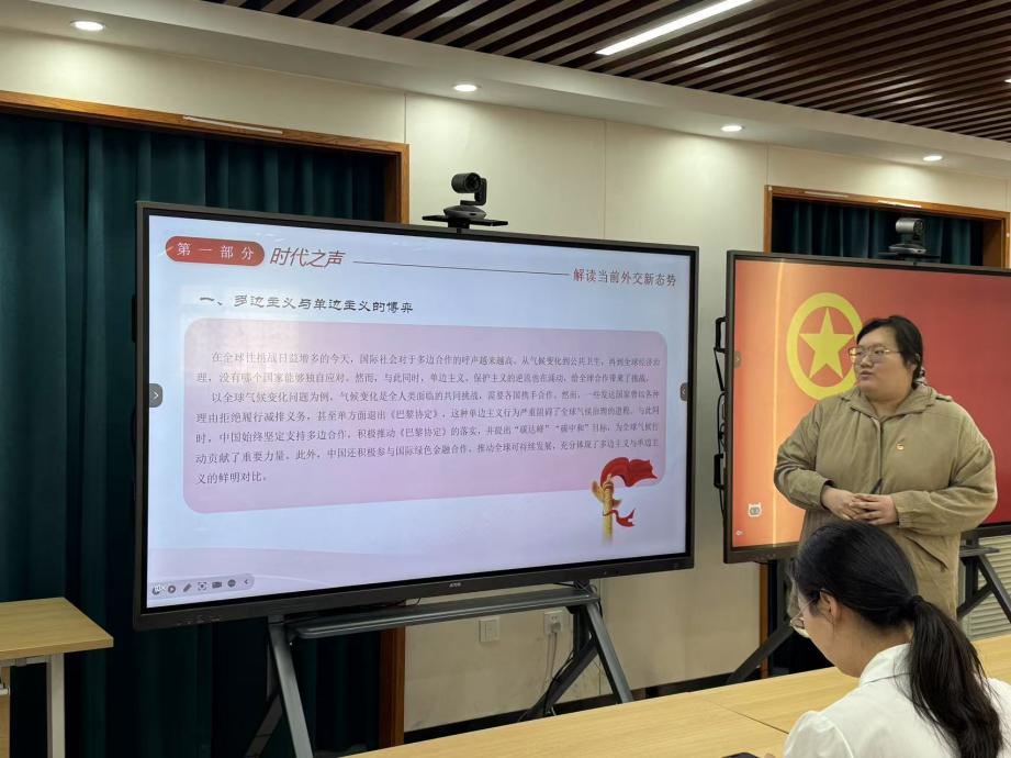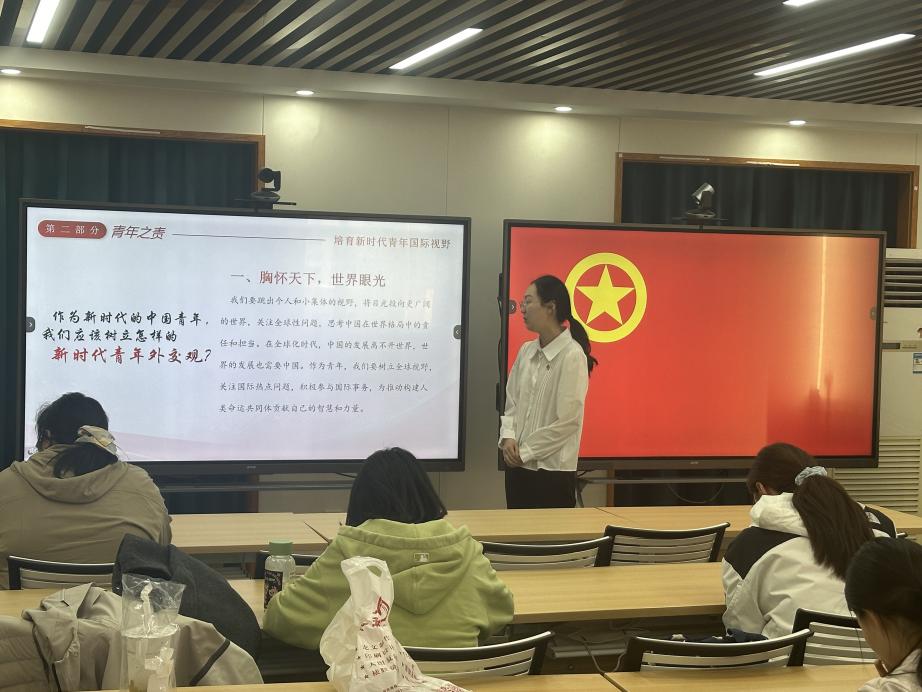 外交学专业2023级团支部于吕振羽楼818教室组织开展“关注外交新动态,培养青年新视野”主题团日活动。活动由23级本科生刘明冼主持,23级1班团支书赵雨彤、2班团支书张湲悦做分享。