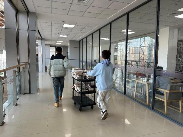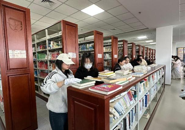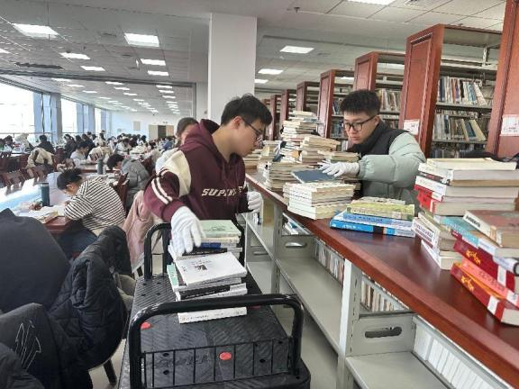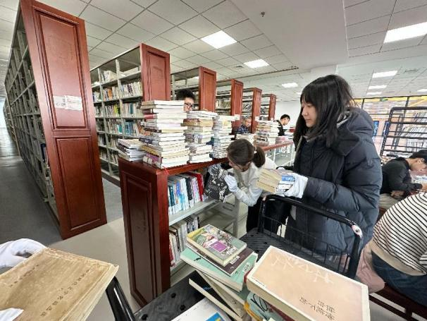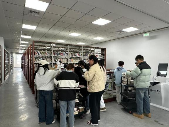 志愿者们前往中心图书馆整理图书资源,切实提升服务品质,共同营造温馨高效的阅读学习环境。