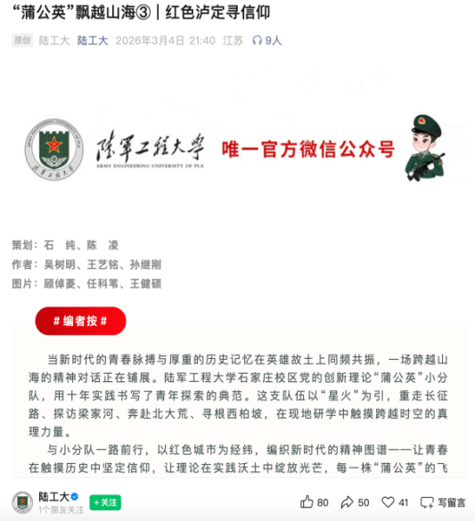 在教育部“2026年全国大学生践行总体国家安全观”宣讲活动中,宣讲团围绕统筹高水平对外开放与国家安全开展联学联讲,进一步提升了青年化表达和理论阐释能力。同时,团队积极参与第五届全国高校“小青马”联学联讲暨集体备课,将长征精神传承与新时代国家安全教育相结合,在红色研学、基层宣讲中展现吉大学子的责任担当。在陆军工程大学“重走长征路”宣讲调研中,团队形成了校际联动、军地协同、线上线下融合的实践格局。