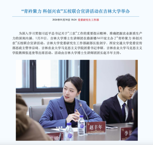 宣讲团充分发挥专业优势,围绕“青衿聚力、科创兴农”主题,与西安交通大学、中国农业大学、吉林农业大学、西北农林科技大学等高校开展五校联合宣讲,原创讲稿《一粒米的征途:以粮为安,筑牢大国根基》,从种子、土地、农民、技术四个维度系统阐释粮食安全的重要意义。团队成员赴吉林省梨树县实地调研,围绕“梨树模式”、黑土地保护等内容完成讲稿撰写、视频录制及成果报送,将专业学习、现实调研与国家安全教育有机融合。