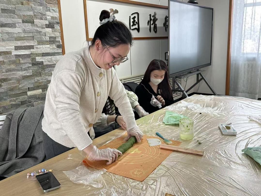 进入实践制作环节,同学们分组动手尝试。从生疏笨拙到熟练流畅,一个个圆润可爱的青团在掌心成型。活动现场欢声笑语,艾草香气与春日暖意交织弥漫。